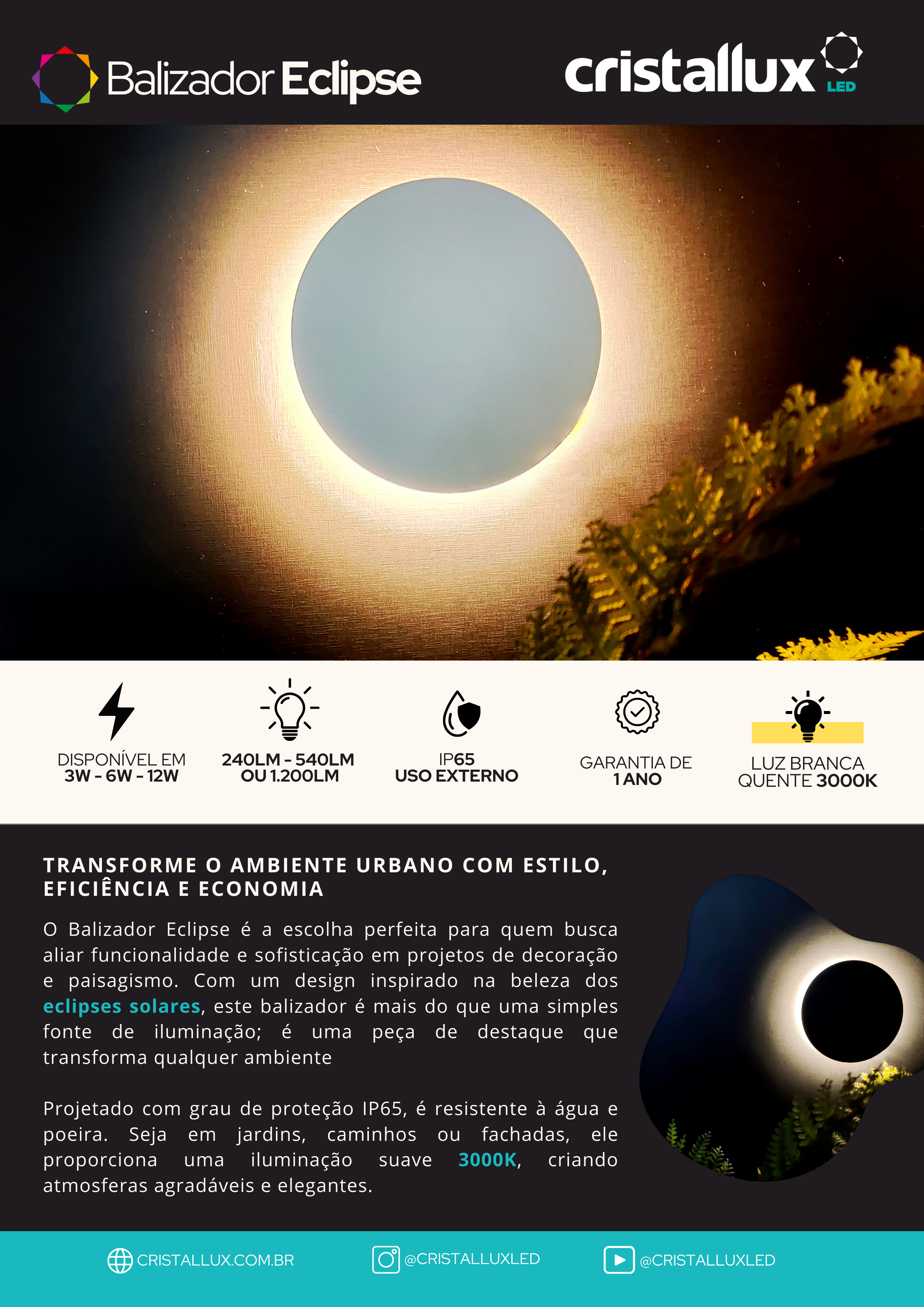 BALIZADOR CRISTALL WALL ECLIPSE PRETO REDONDO 6W 3000K