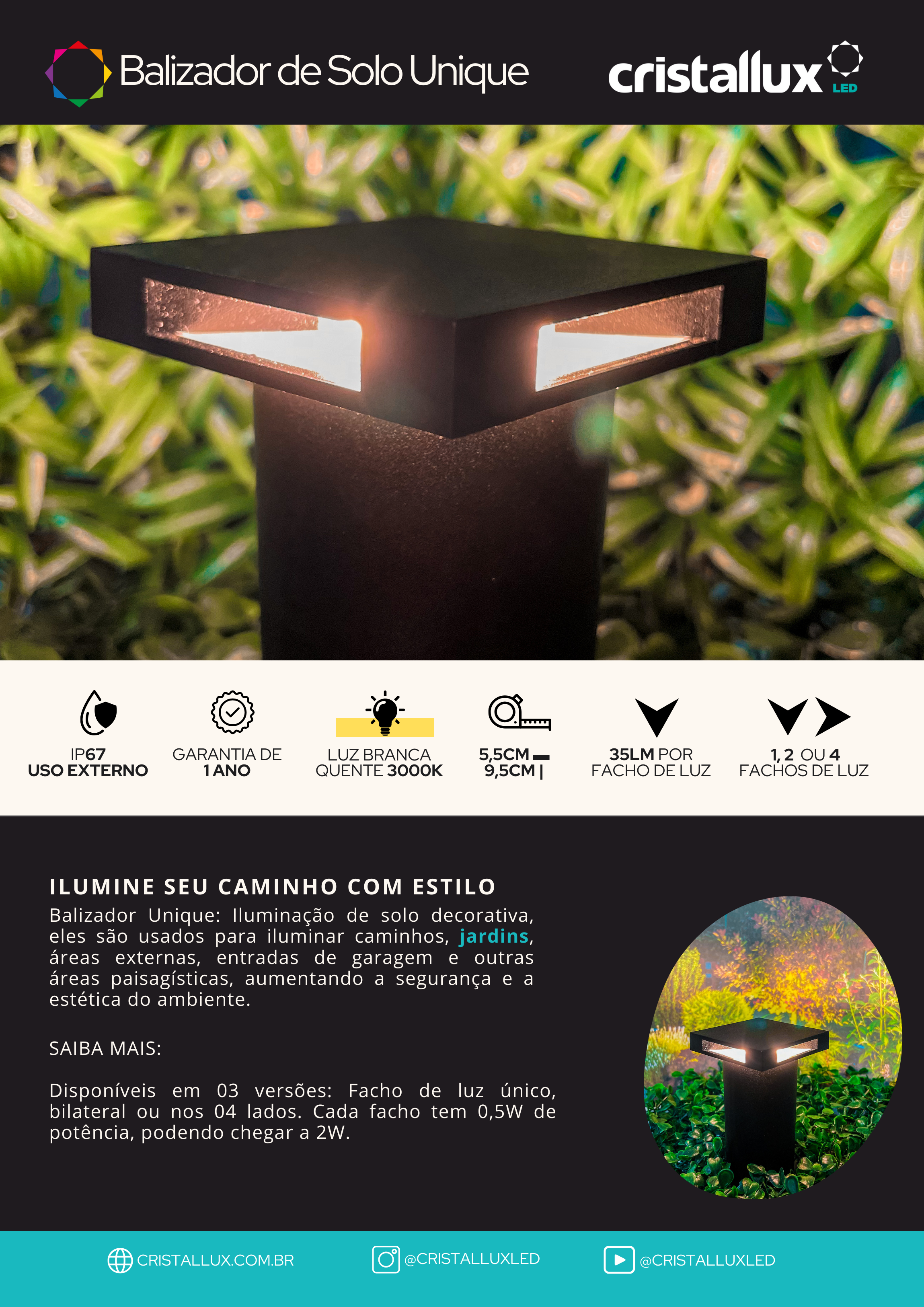 BALIZADOR DE SOLO CRISTALL GARDEN UNIQUE PRETO QUADRADO 2W 3000K 4 FACHOS DE LUZ