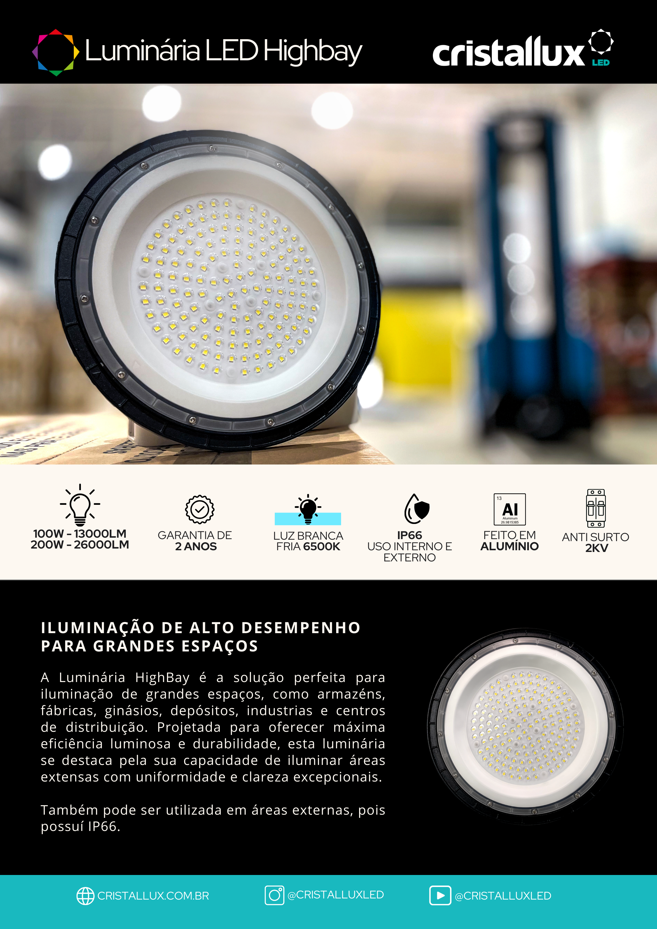 LUMINARIA LED HIGHBAY 100W 6500K 13000 LUMENS IP66