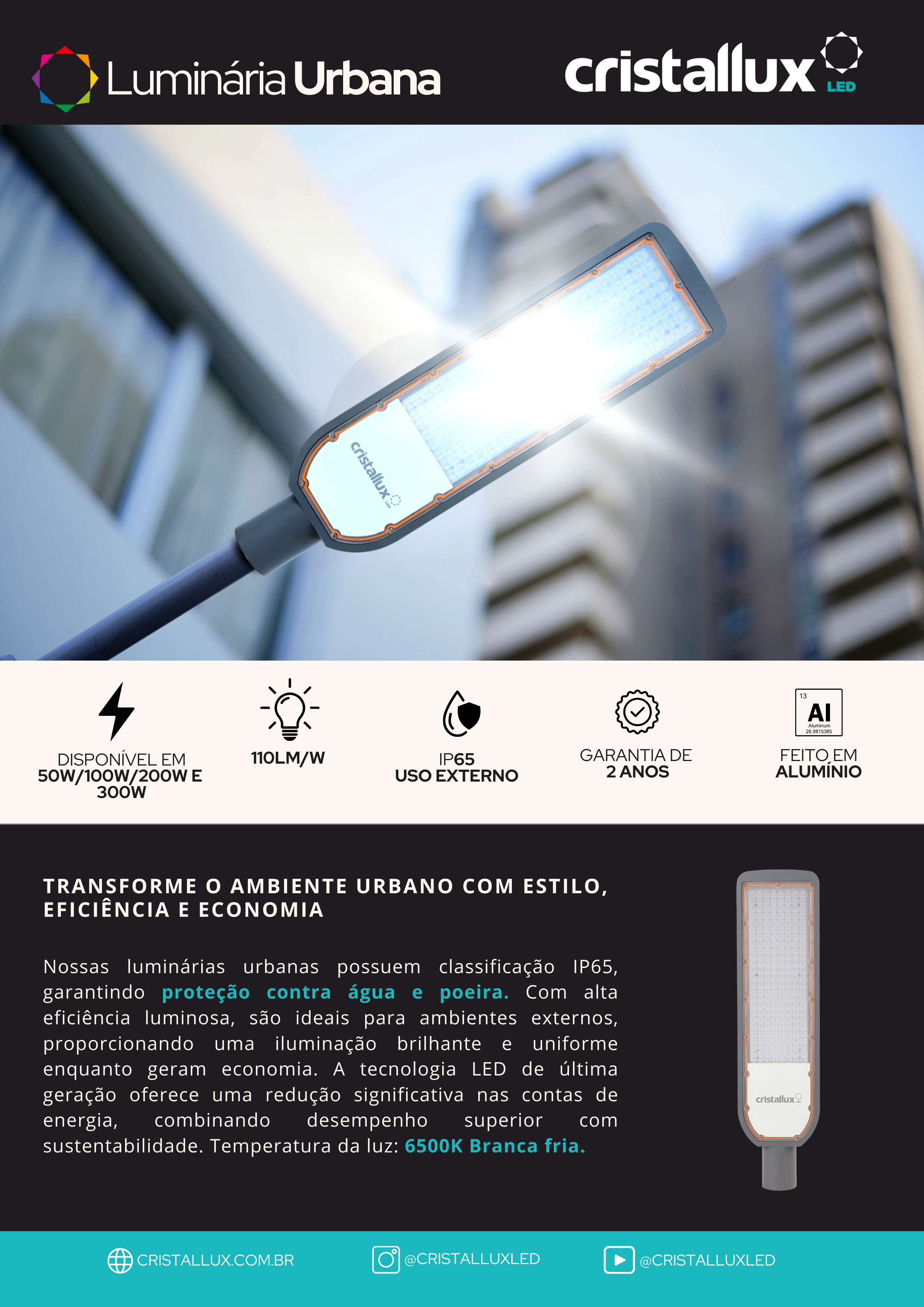 LUMINARIA URBANA LED 50W 6500K 5500 LUMENS DIAMETRO DO BRAÇO 45,74MM IP65