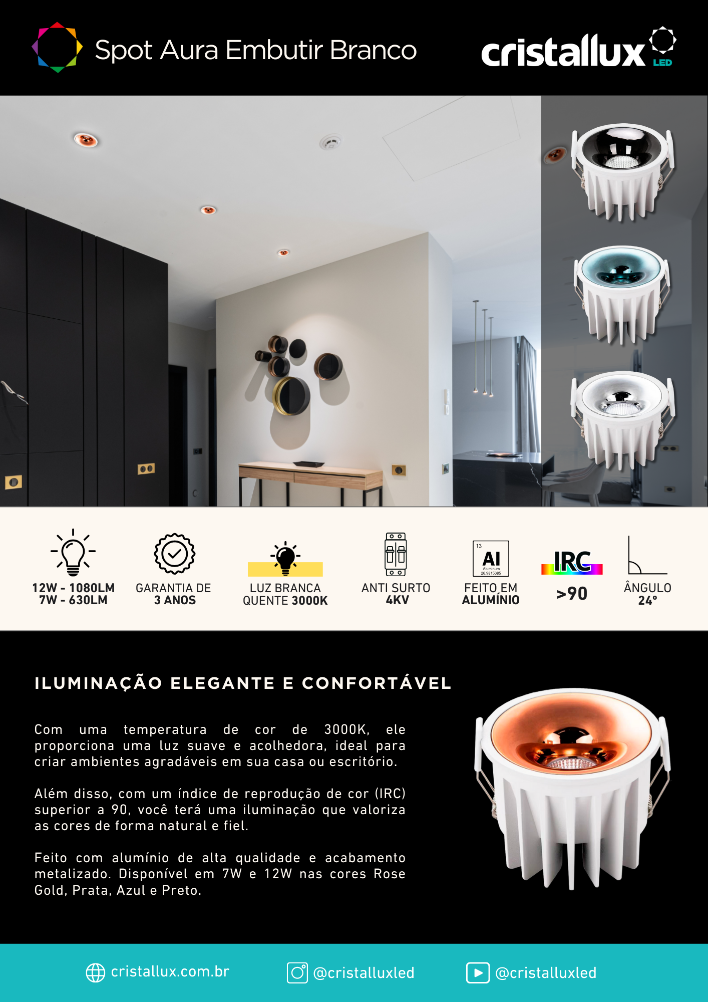 SPOT CRISTALL PRO AURA SOBREPOR BRANCO 12W 3000K GUN BLUE BIV.