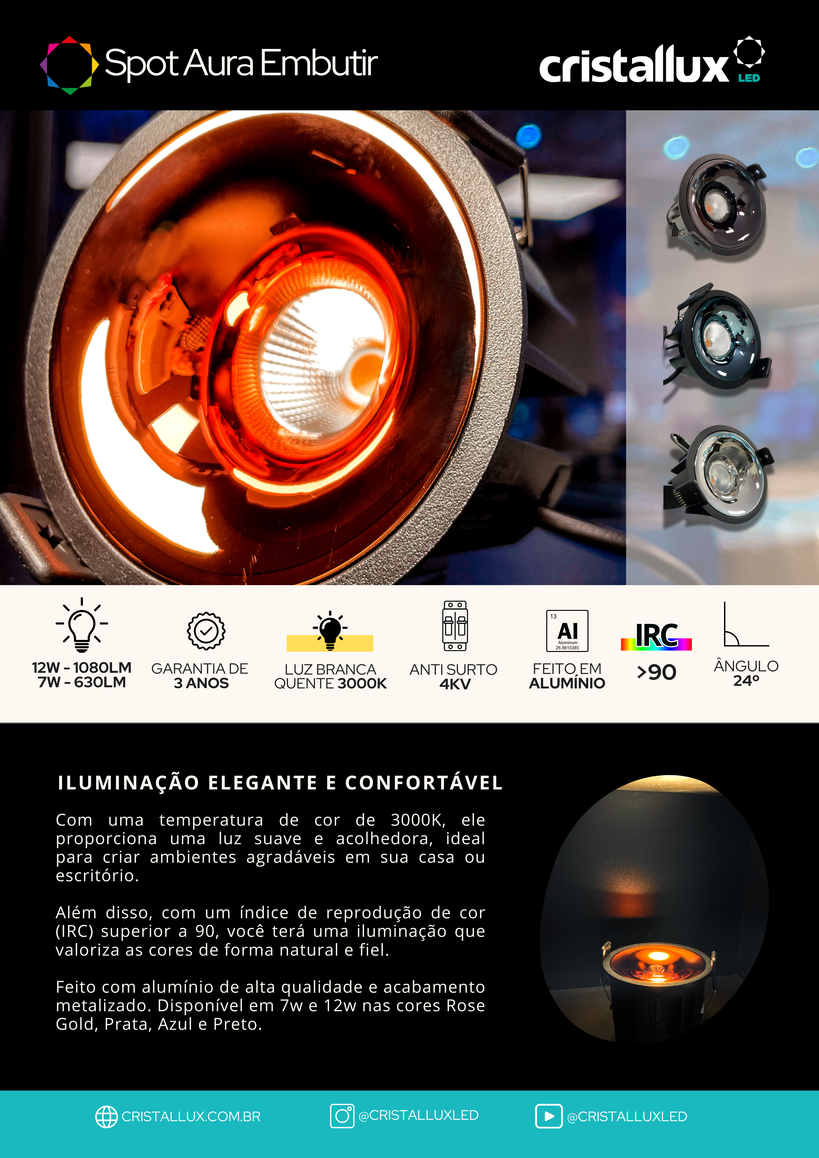 SPOT CRISTALL PRO AURA SOBREPOR PRETO 12W 3000K SILVER